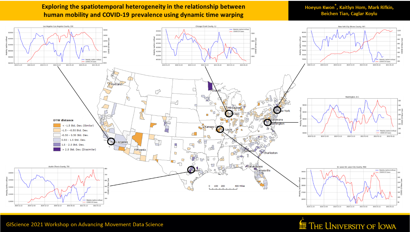 Kwon, H., Hom, K., Rifkin, M., Tian B. & Koylu, C. (2021). Exploring the spatiotemporal heterogeneity in the relationship between human mobility and COVID-19 prevalence using dynamic time warping. GIScience 2021 Workshop on Advancing Movement Data Science (AMD’ 2021), September 27, 2021, World Wide Web. DOI: https://arxiv.org/abs/2109.13765
